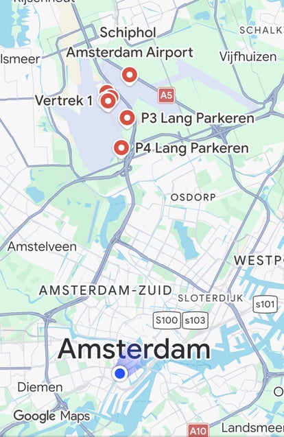 (after collecting luggage take the elevator and come 1 floor upstairs to departure 3, exit door C, cross over the road)